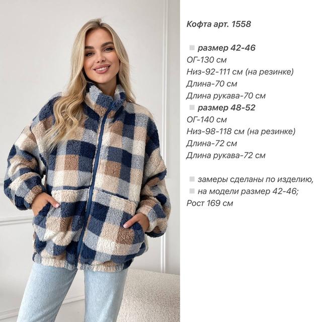 Затишна тепла жіноча кофта-хустка на змійці в карту хутро Тедді синє з бежевим