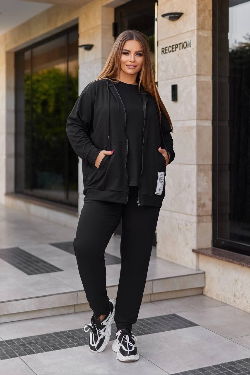 Чорний жіночий спортивний костюм-трійка з двонитки батал: худі, футболки та штани