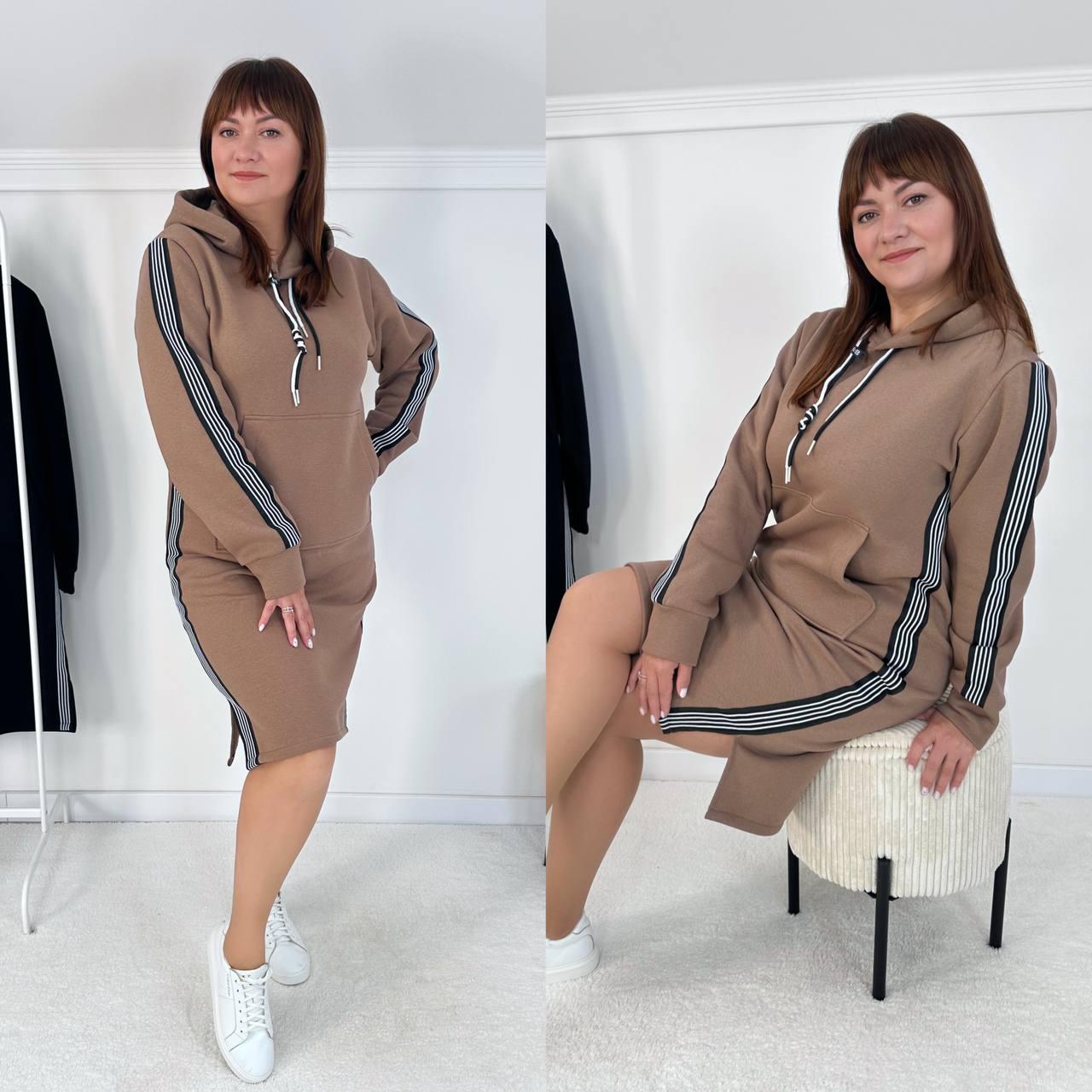 Тепле кавове плаття в спортивному стилі з капюшоном із турецької тринитки на флісі батал