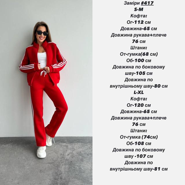 Опис: Зручний і стильний спортивний костюм із турецької тринитки на флісі, що забезпечує тепло та комфорт. Костюм складається з куртки з блискавкою та штанів на еластичному поясі. Контрастні смужки на рукавах і штанах додають динамічного акценту, надаючи костюму спортивного стилю. Доступний у різних кольорах: чорний, марсал, червоний, березовий, графіт і шоколад. Розміри S-M і L-XL підійдуть для різних типів фігур.