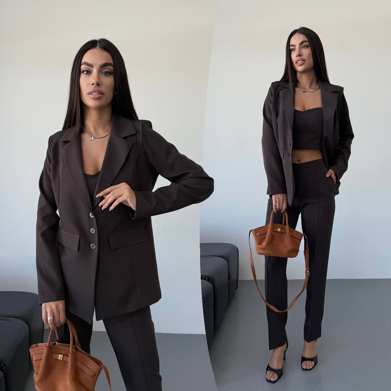 Коричневий стильний жіночий костюм-трійка: штани, топ і піджак