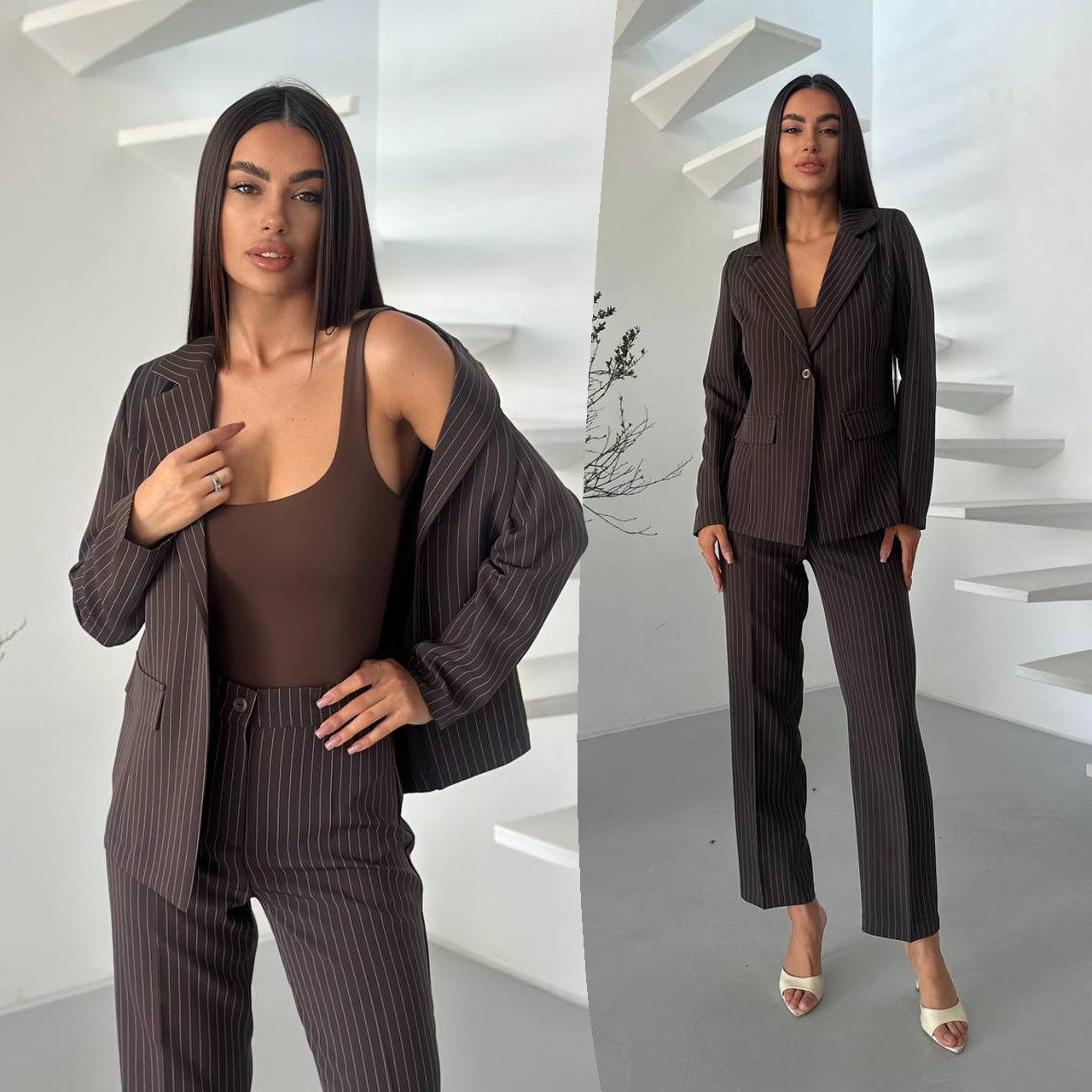 Коричневий жіночий класичний костюм у дрібну смужку: піджак і штани